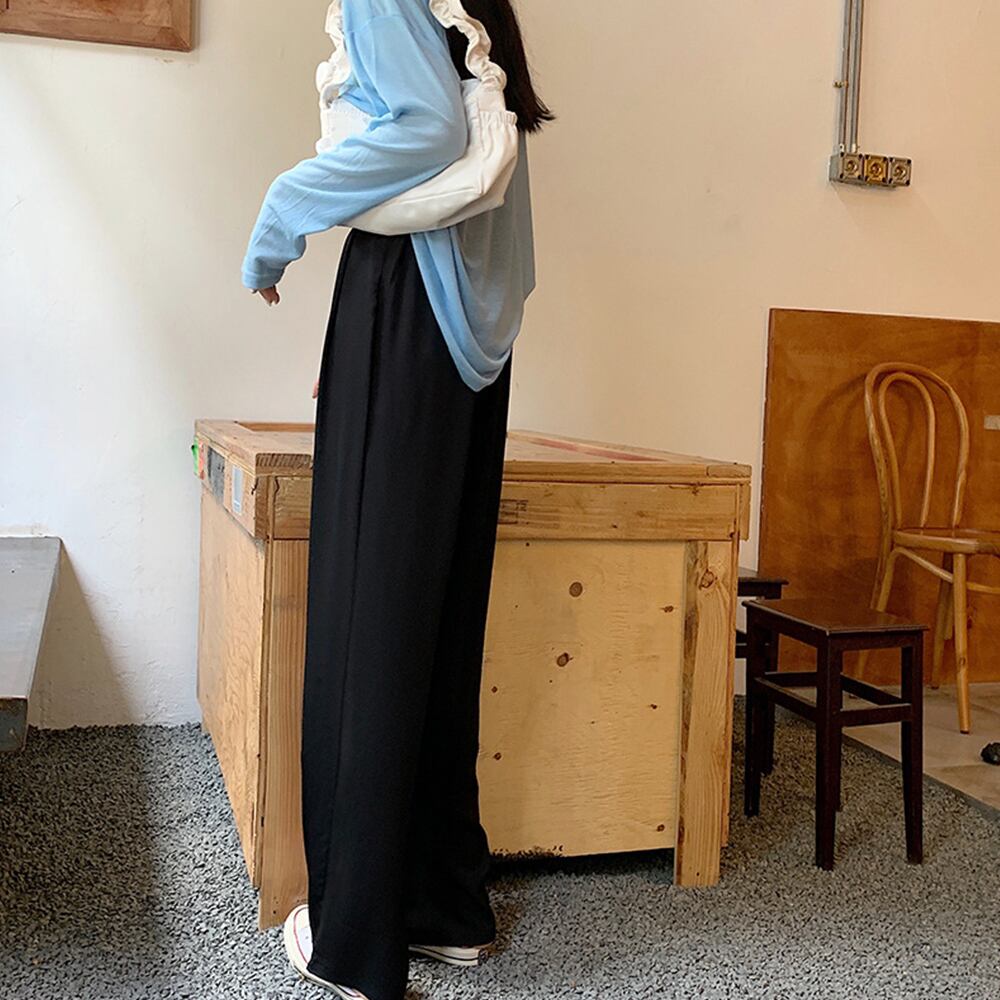 セミワイドシルエットながらも素材に落ち感があるので、すっきりと上品に穿きこなせるのが魅力的