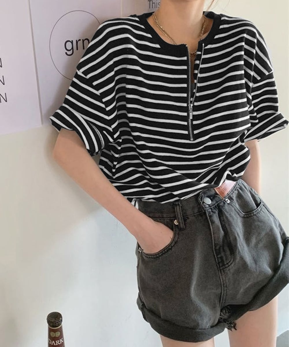 ハーフジップTシャツ 5分袖 着やせ 体型カバーカットソー ゆったり 大人カジュアル プルオーバーラウンドネック 韓国風