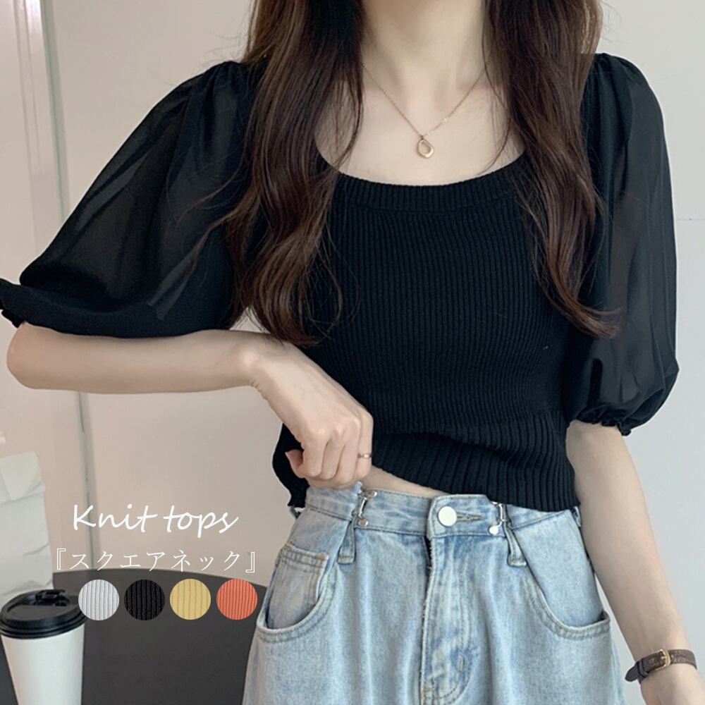 レディース スクエアネック ニットブラウス 異素材 パフスリーブ シャツトップス お洒落 フェミニン