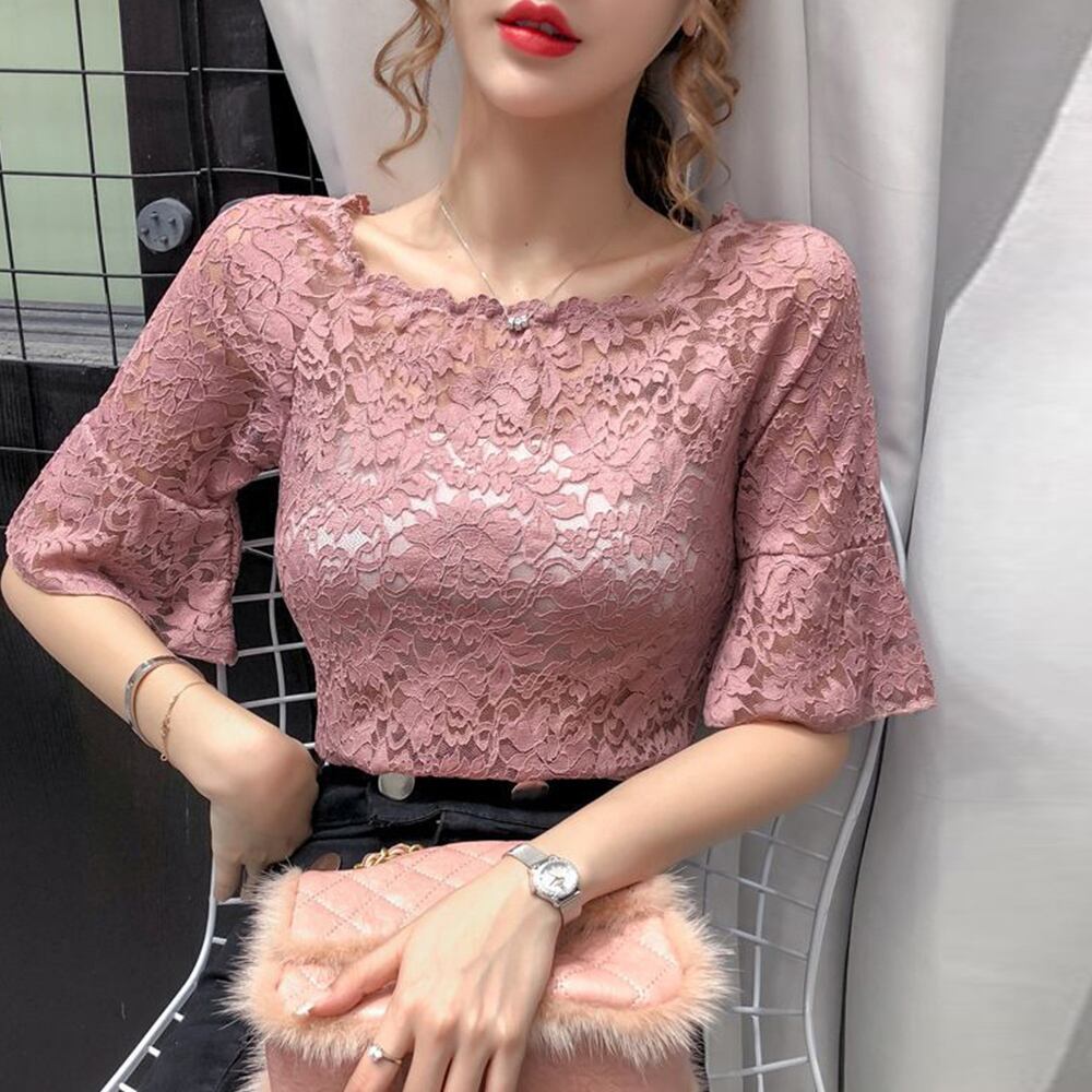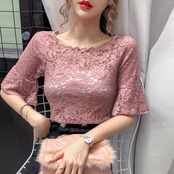 五分袖ブラウス春夏 シースルーインナー 花柄レーストップス
