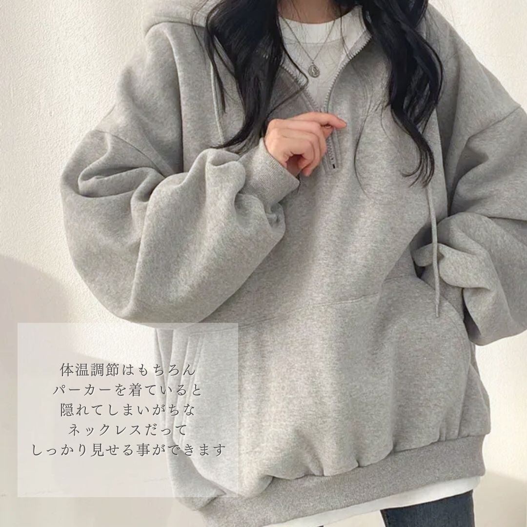 パーカーだし着膨れするんじゃないの?なんて思ってる方!サイズ表記をご覧下さい!肩幅もバストもゆったりめに作られているのでインナーを着てもゆとりを持ったままパーカーを着ることが出来ますよ♪