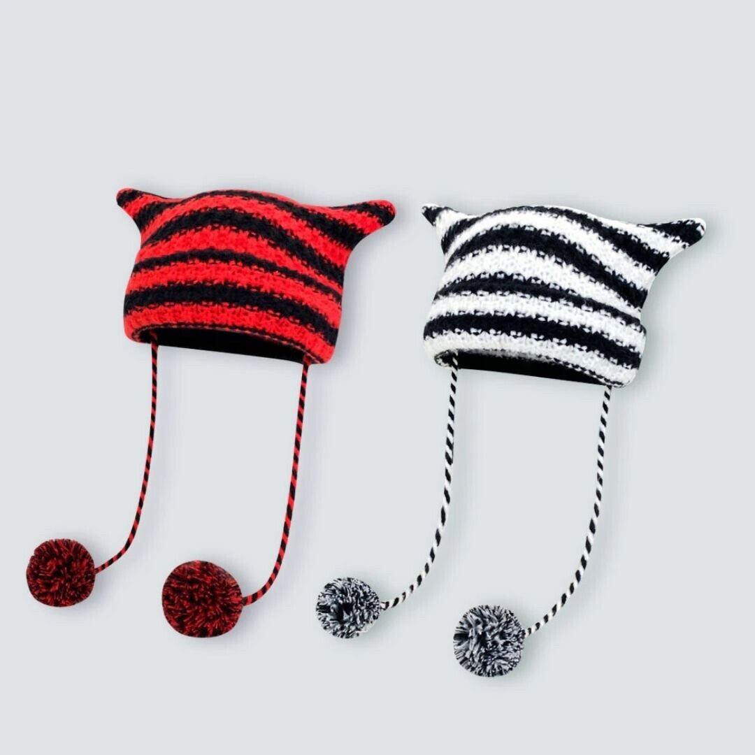 帽子 猫耳 シマシマニット帽 ポンポン付き 全3カラー 男女兼用 防寒 韓国ファッション メンズ レディース