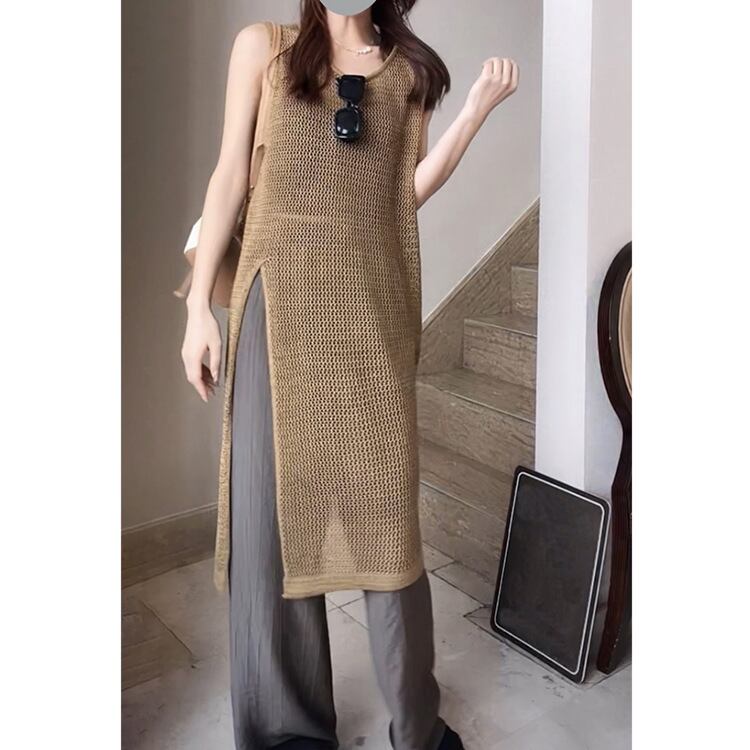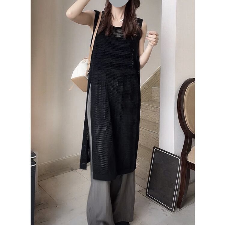 メッシュ ニットベスト ロング丈ベスト スリット レディースファッション