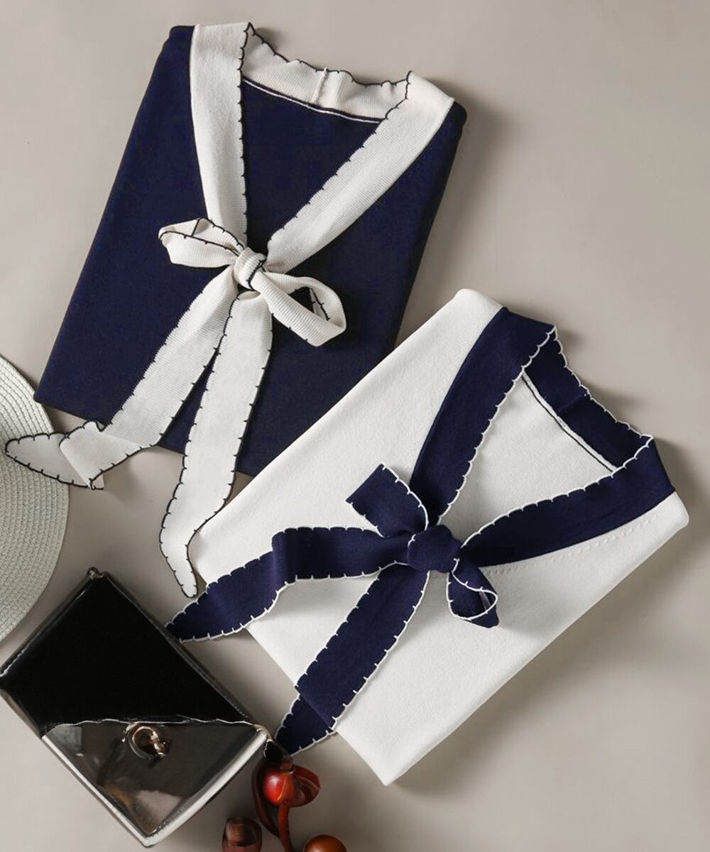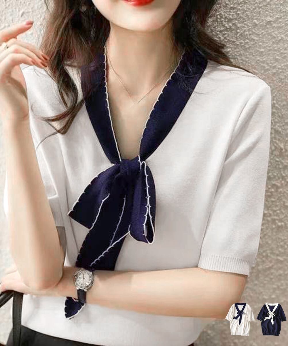 衿元が華やかな配色デザインのボウタイ付きニットプルオーバー