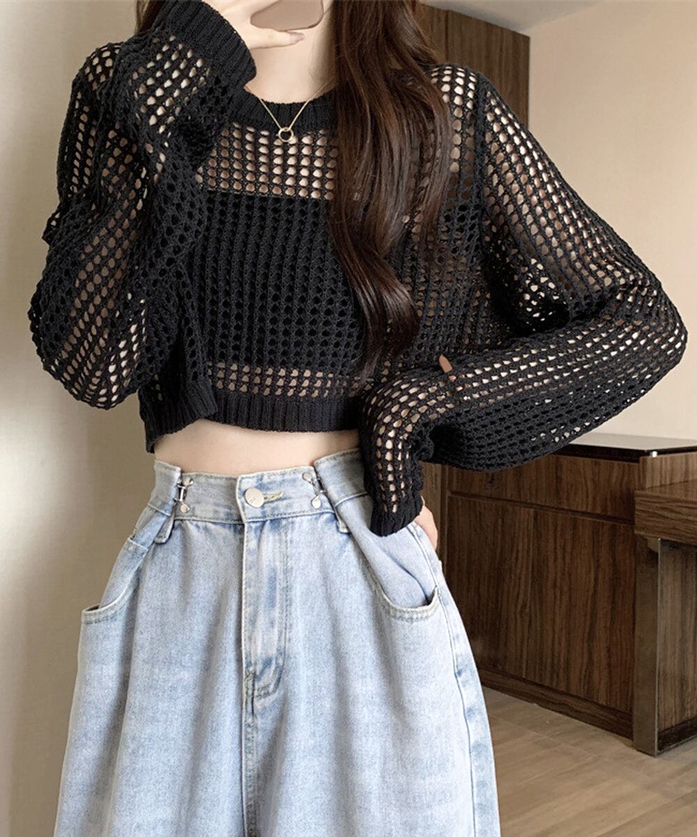 透け感 重ね着 ゆったり セクシー 透かし編みトップス