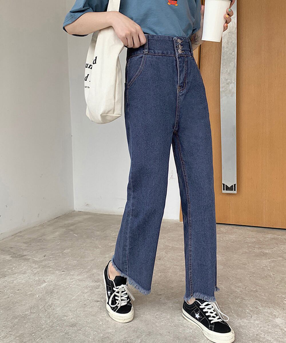 レディース ダメージ ストレートデニムパンツ 大人カジュアルジーパン 体型カバー美脚脚長 セミワイドデニム カットオフ