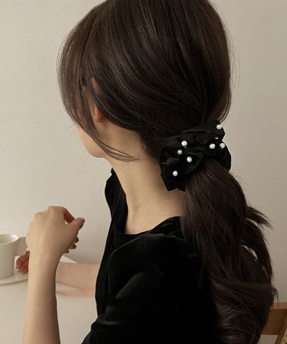 ベルベット生地にフェイクパールが飾った大人上品なシュシュ
